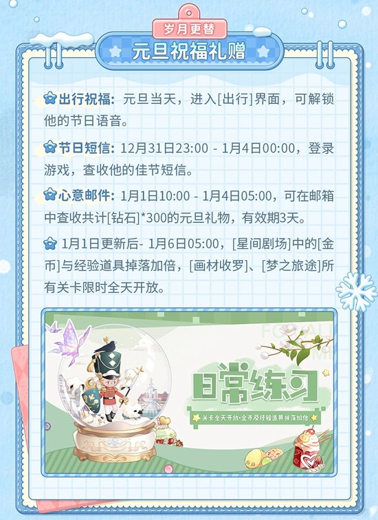 1月1日更新后-1月6日05:00,[星间剧场]中的[金币]与经验道具掉落加倍,[画材收罗]、[梦之旅途]所有关卡限时全天开放。