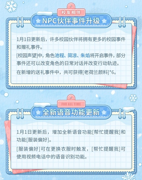 1月1日更新后,许多校园伙伴将拥有更多的校园事件和赠礼事件。