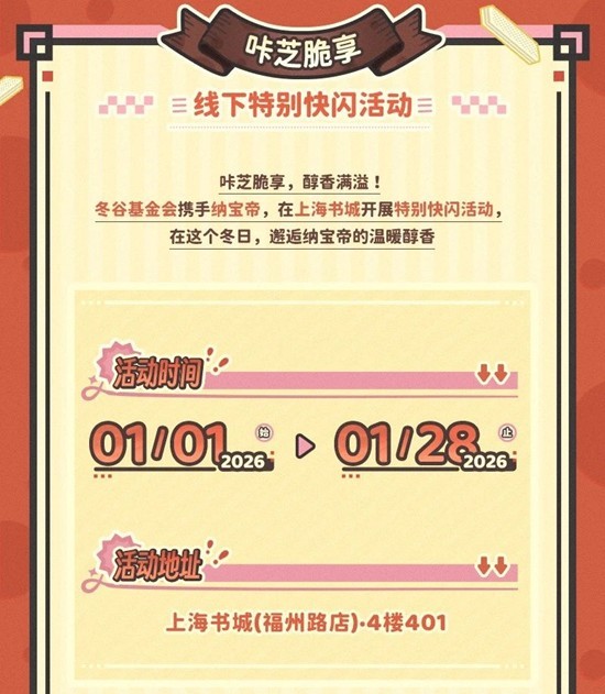 物华弥新×纳宝帝咔芝脆享上海线下快闪1月1日开启~冬谷基金会携手纳宝帝,在上海书城开展特别快闪活动,在这个冬日,邂逅纳宝帝的温暖醇香。活动期间,在快闪门店购买《物华弥新》周边,单笔订单满238元,有概率获得籁古新音巡回音乐会门票、周边福袋、周边优惠券等惊喜好礼!一起来和小编看看吧~