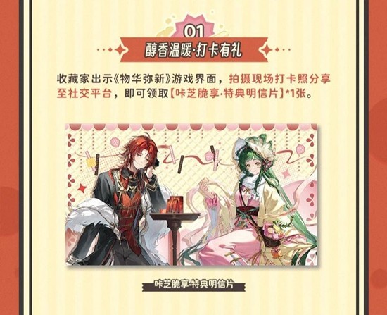 收藏家出示《物华弥新》游戏界面,拍摄现场打卡照分享至社交平台,即可领取【咔芝脆享·特典明信片】*1张。