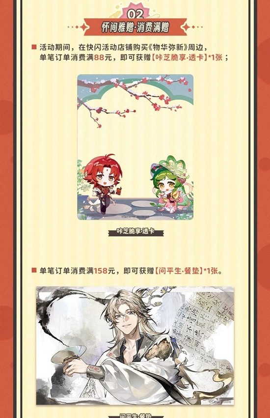 活动期间,在快闪活动店铺购买《物华弥新》周边单笔订单消费满88元,即可获赠【咔芝脆享·透卡】*1张;