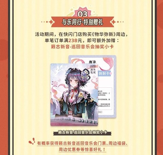 活动期间,在快闪门店购买《物华弥新》周边,单笔订单满238元,即可额外加赠:籁古新音·巡回音乐会抽奖小卡