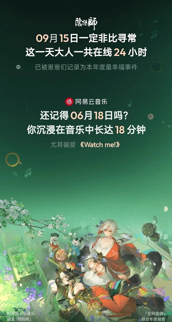 ※大人可在网易云音乐搜索【阴阳师】,进入页面完成绑定授权后,即可查收自己的联合年度报告,回顾本年度与崽崽共度的点滴~