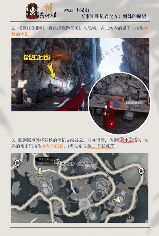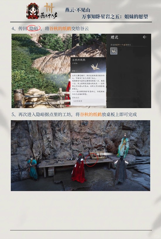 3、回到据点外将谷秋的笔记交给谷云。对完话后,传到水云,在鸦的密室里拾取谷秋的纸鹤,(需先完成卷二·有谷芃芃)