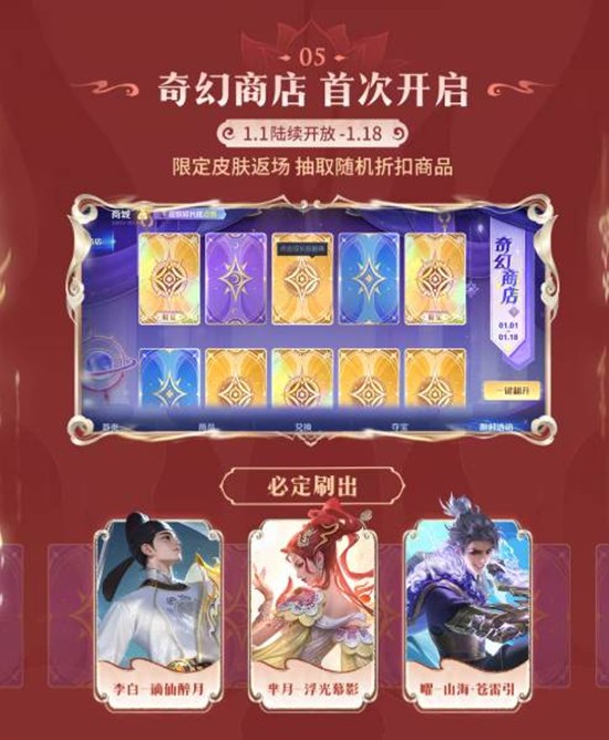 奇幻商店也将首次开启,玩家可以在这里抽取随机折扣,购买包括【李白-谪仙醉月】、【曜-山海·苍雷引】和【芈月-浮光幕影】等限定皮肤。