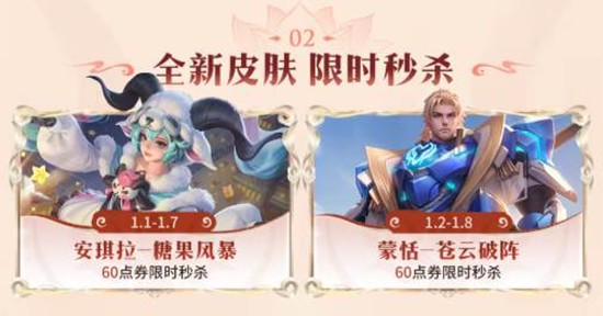 除了免费皮肤,还有【安琪拉-糖果风暴】和【蒙恬-苍云破阵】两款新皮肤将以60点券的优惠价格进行限时秒杀,为玩家提供更多选择。