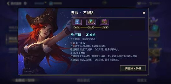 大师29星以下:每日5排不限段次数额外+2,99星以下:每日5排不掉钻次数+1,组队开黑无压力,段位冲刺稳了!