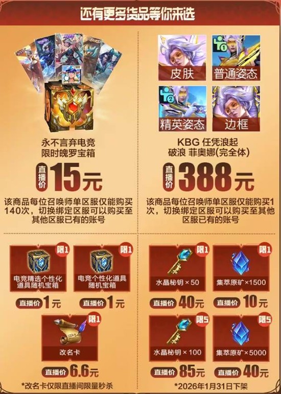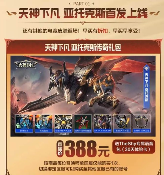 1月2日14:30,手游官方抖音/B站/快手同步开播“TheShy天神首秀”,选手本人将使用新皮肤进行水友赛,直播间掉落“皮肤免单券”×100;