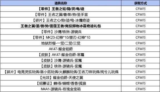 CFM币可以兑换一些王者副武器以及其冰霜奇迹皮肤;王者投掷物冰霜奇迹礼包和王者手雷;一些武器套装的副武器、近战武器以及一些早期赏金令产出的角色招募证。其中,王者投掷物冰霜奇迹礼包包括手雷、闪光弹以及烟雾弹的冰霜奇迹皮肤。