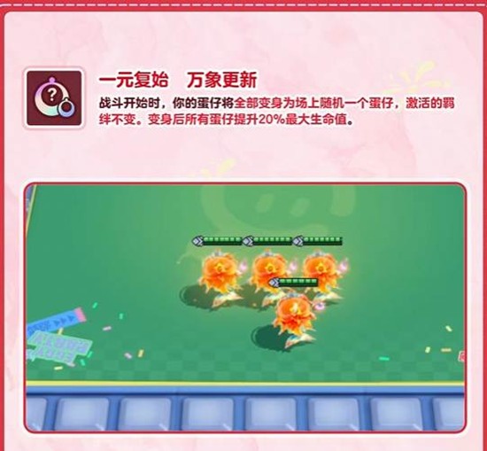 一元复始(紫)开局全员变身:战斗开始时,你的所有蛋仔随机变成场上任一蛋仔(技能继承),并立刻+20%最大生命值,一把体验“万象归一”。