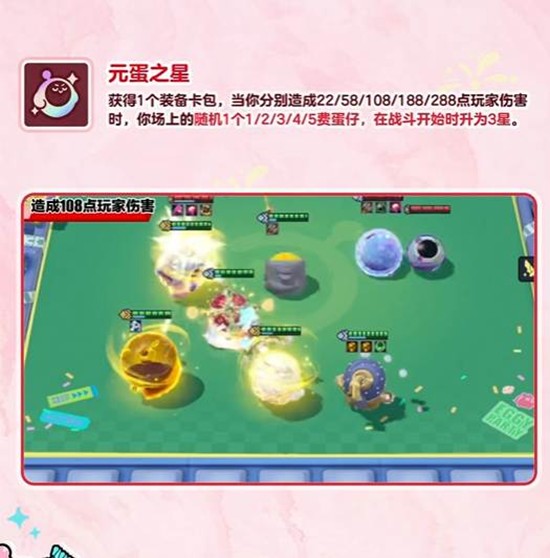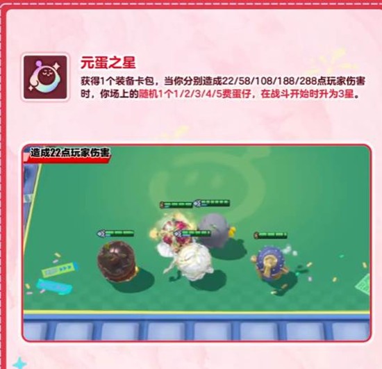 元蛋之星(橙)伤害升星:获得1包装备卡;累计对玩家造成22/58/108/188/288伤害时,分别把随机1/2/3/4/5费蛋仔在开局直接升为3星,最快第2回合就能亮出满星大哥。