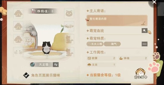 为了让少侠与猫咪们之间的陪伴更加周全,我们对猫舍也进行了一番贴心改造。现在,通过角色界面新增的快捷入口,少侠可以瞬间跳转回猫舍,轻松查看所有猫咪的详情。猫舍的信息面板变得前所未有的清晰,它会为你记录下近期所有重要的点点滴滴:有多少位少侠来撸过你家猫猫、猫猫打工为你赚取了多少收益、哪只小猫的学习属性进步最快......甚至是它们的进食和如厕记录都一目了然。尤其贴心的是,系统会特别提示处于异常状态的猫咪,比如谁饿了、谁心情不好了,方便少侠第一时间给予关怀。