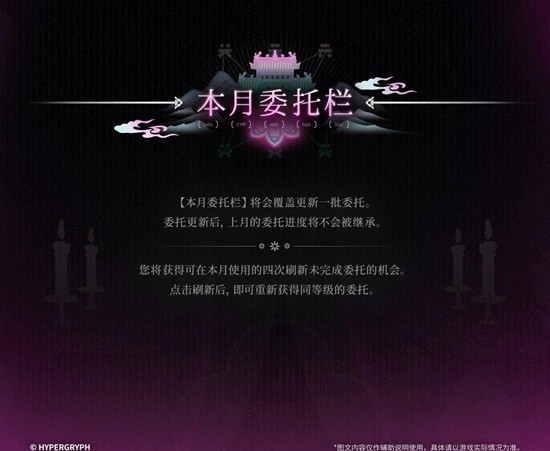 【本月委托栏】将会覆盖更新一批委托。委托更新后,上月的委托进度将不会被继承。