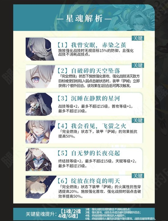 流萤是火系毁灭超击破主c,主要的队伍是击破队,所以流萤依赖同谐主与阮梅。和知更鸟行动条是很相似的,只是数值不变。