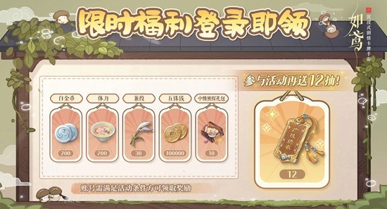 礼包内容:200白金币+200体力+30蒹葭+10中级密探礼物包+100000五铢钱