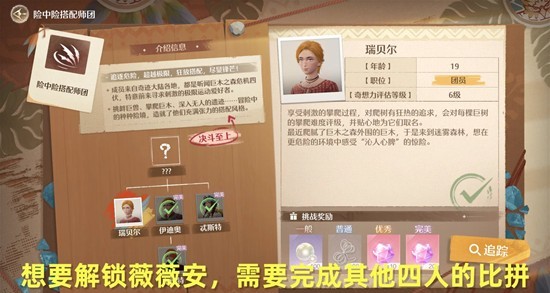 完成其他四人的搭配比赛后,点击搭配实力会出现薇薇安的名字,点击问号旁边的箭头;