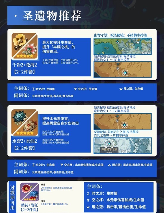 圣遗物推荐:①千岩2+花海2,②水仙2+沉沦2,③赌徒2+战狂2(过渡)
