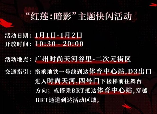胜利女神:新的希望红莲:暗影角色主题快闪活动在广州时尚天河谷里-二次元街区盛大开启。活动将于2026年1月1日至2日,每天10:30至20:00举行,为指挥官们带来一场沉浸式的体验。