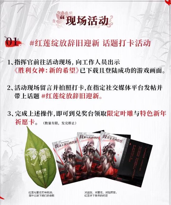 指挥官将有机会亲临现场,感受红莲与蔷花的感人故事。通过与她们的武艺切磋,指挥官们可以更深入地了解这两位角色背后的故事和她们的力量。参与现场的打卡活动,指挥官们将有机会领取《胜利女神:新的希望》的限定周边。这些周边不仅设计精美,而且数量有限,先到先得,绝对值得收藏。