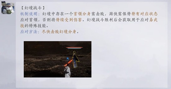 1-3:同样是幻境战斗,第一点,每次都会出现两个幻境,你只需要挑两个人进入同一个就行,另一个不管,第二点,除去BOSS平A,其它技能伤害都不能吃,第三点,外面的人做好续航续buff。接下来是技巧部分,火幻象进去的两个人顺时针绕圈跑,冰幻象一起移动都行,卸红光躲黄光和地上的火圈,可以带毒让它气竭快一点,气竭再上去输出。