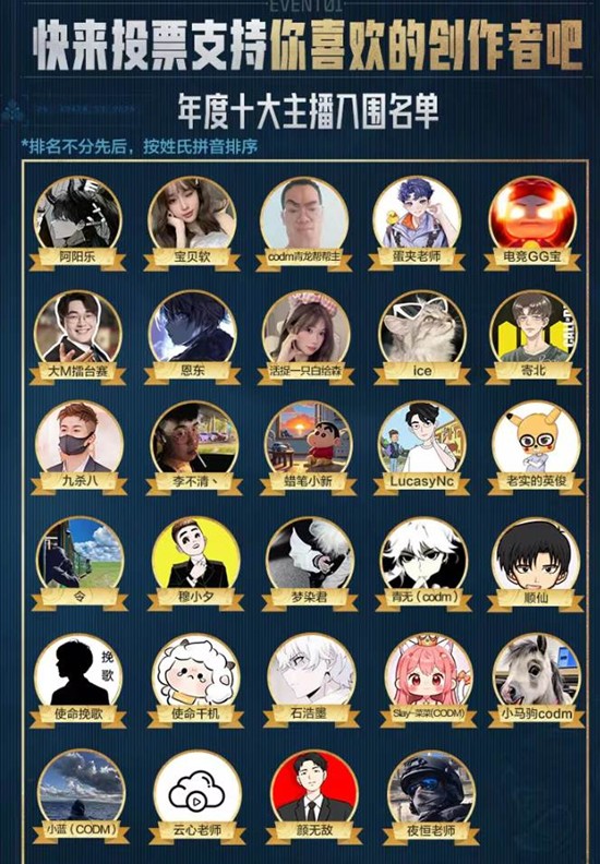 阿阳乐、宝贝软、codm青龙帮帮主、蛋夹老师、电竞GG宝、大M播台赛、恩东、活捉一只白给森、ice、寄北、九杀八、李不清、蜡笔小新、LucasyNc、老实的英俊、穆小夕、梦染君、青无(codm)、顺仙、挽歌、使命歌、使命千机、石浩墨、Slay一菜、小马驹codm、小蓝(CODM)、云心老师、颜无敌、夜恒老师……