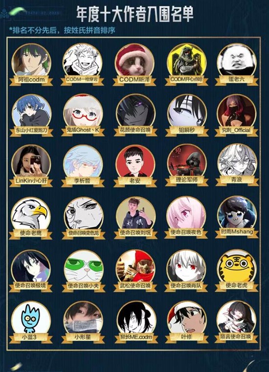 阿祖codm、CODM-一枪穿云、CODM昕泽、CODM开心点哈、蛋老六、东山小红爱跑刀、鬼道GhostK、花颜使命召唤、狙瞬秒、究刺_Official、JUNSHE、LinKin小心肝、李析哲、老安、理论军师、青浪、刘氓、使命老鹰、使命召唤变色龙、使命召唤夜色、时雨Mshang、使命召唤极境、使命召唤小夫、武松使命召唤、使命召唤肖队、使命老虎、小蓝3、小形星、狱长ME.codm、叶修、陨言使命召唤……