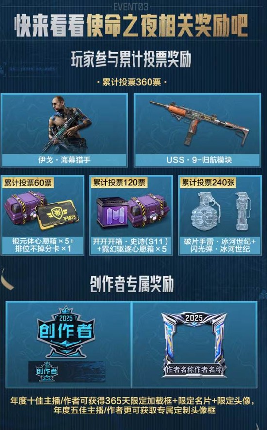 赶紧打开游戏,点击首页「使命之夜」轮播图,投出你手中关键一票,把喜欢的创作者送上年度 C 位!