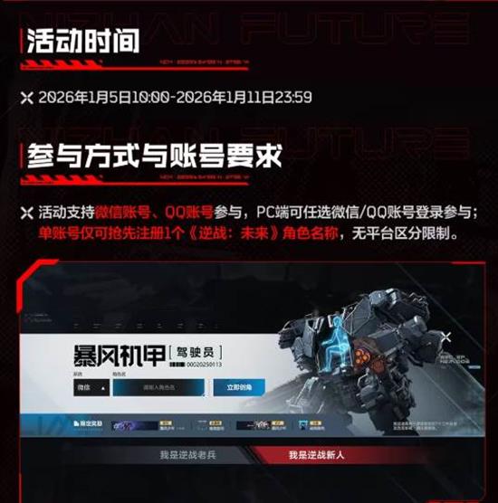 活动支持微信账号和QQ账号参与,玩家可以在PC端通过微信或QQ账号登录参与。需要注意的是,单个账号仅可抢先注册1个《逆战:未来》角色名称,且多端互通,同一账号在安卓/IOS/PC系统均无法重复注册。