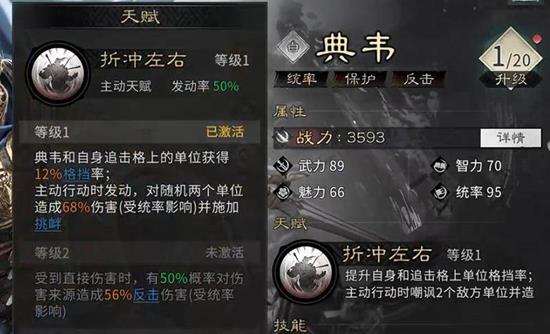 当玩家将典韦的技能提升至二级后,他在受到攻击时,还有概率对伤害来源发动一次反击。因此,典韦的定位是以反击和挑衅为核心的前排坦克,在战斗中的主要作用是提供格挡增益并保护己方的主要输出武将。