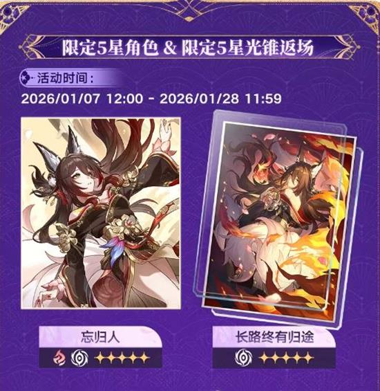 2026年1月7日12:00至1月28日11:59,崩坏星穹铁道3.8版本「跃迁第二期」准时上线,限定五星角色「忘归人(虚无火)」「灵砂(丰饶火)」与五星光锥「长路终有归途」「唯有香如故」迎来概率提升,想要补强火系输出的开拓者记得锁定本期卡池。