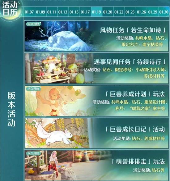 1月7日12:00-1月20日23:59,完成每日任务(消耗体力、分享、登录)可获得「诗页」×50,累计7天可在活动页面领取钻石×500、体力×300、限定称号「诗与远方」。额外使用钻石可兑换双倍奖励,每日限购1次。