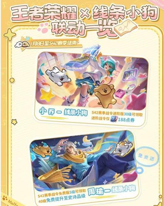 进阶路线:188点券解锁小乔-线条小狗,同步配套联动回城、拖尾、击败特效,战令商店额外上架个性按键与动态表情,战令币即可兑换。