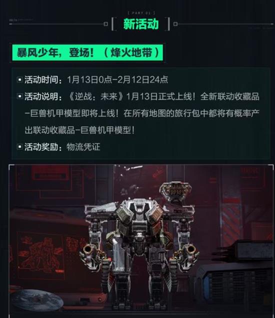 活动时间为1月13日0点至2月12日24点。在活动期间,《逆战:未来》将推出全新联动收藏品——巨兽机甲模型。玩家在所有地图的旅行包中都将有概率产出这一联动收藏品。此外,活动奖励还包括物流凭证,为玩家提供更多的游戏资源。