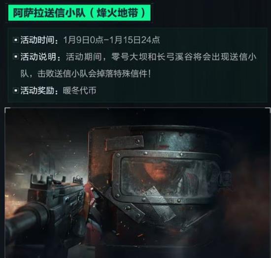 活动时间为1月9日0点至1月15日24点。在活动期间,零号大坝和长弓溪谷将会出现送信小队,击败送信小队会掉落特殊信件。玩家通过收集这些信件,可以获得活动奖励——暖冬代币,用于兑换游戏内的各种道具和装备。