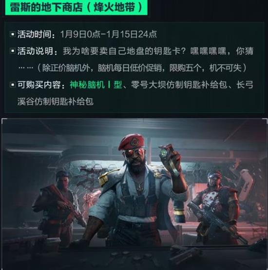 活动时间同样为1月9日0点至1月15日24点。雷斯的地下商店将提供每日低价促销,限购五个,机不可失。玩家可以购买到神秘脑机Ⅰ型、零号大坝仿制钥匙补给包、长弓溪谷仿制钥匙补给包等珍贵物品。