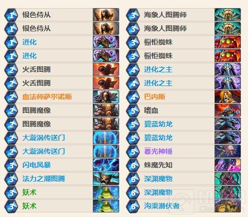 3.本卡组中:橱柜蜘蛛、海象人图腾师、巴内斯(考虑起手留换牌,巴内斯约一半概率拉5费及更高费随从)和英雄技能生产的图腾都是进化的主要原料,蓝龙、深渊魔物、火爹一般在发挥部分效果之后进化滚雪球。