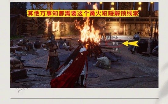 3、时间调整到第三天晚上(建议子时)前往篝火处,交互"取暖"参与对话,获得李抱月线索;