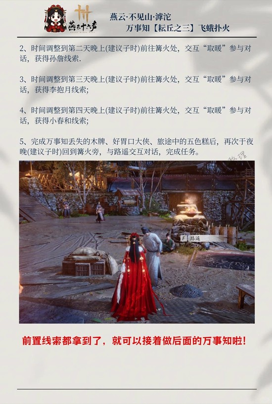 5、完成万事知丢失的木牌、好胃口大侠、旅途中的五色糕后,再次于夜晚(建议子时)回到篝火旁,与路遥交互对话,完成任务。