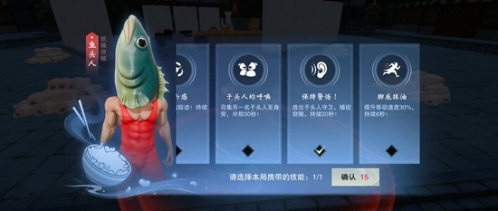 鱼头人技能:加移动速度/20s站桩守卫(优选)/召唤队友到身边/找窃贼踪迹