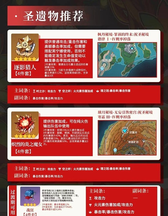 圣遗物推荐:①首推魔女四件套 ②猎人套需要搭配芙宁娜 ③战狂(过渡期)
