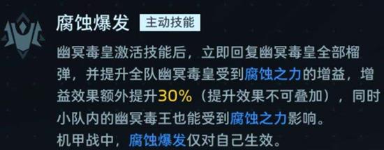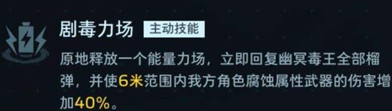 幽冥毒皇还配备了实用的主动技能。剧毒力场技能可以瞬间补满所有榴弹弹药,并为队友的腐蚀属性武器提供伤害加成,是关键时刻的续航与爆发手段。腐蚀爆发技能则更侧重于团队辅助,激活后同样回复全部榴弹,并能显著提升全队受到的腐蚀之力增益效果。