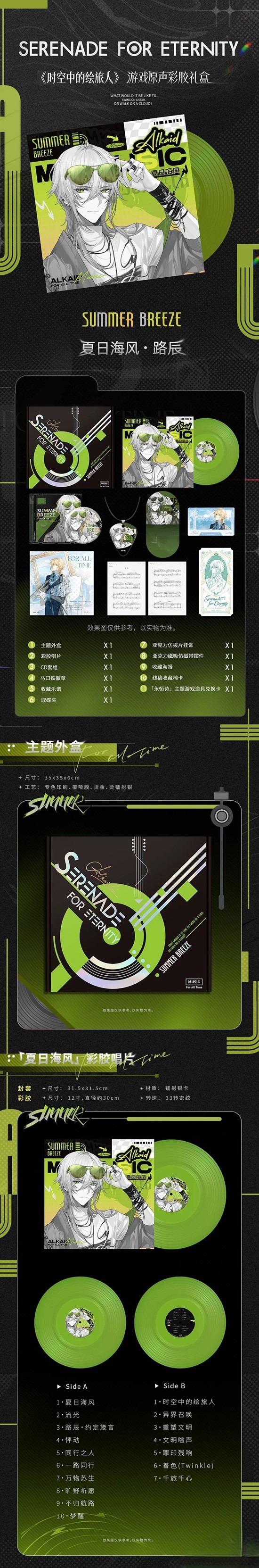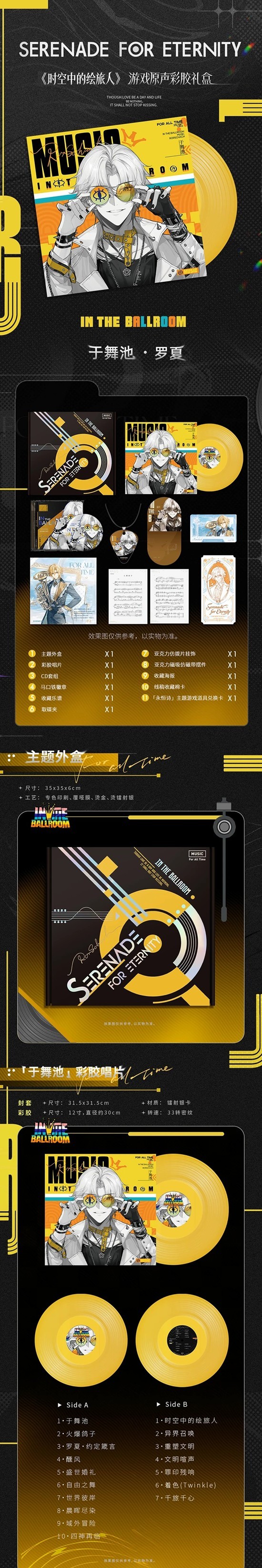 ► 礼盒内容:主题外盒、彩胶唱片、CD套组、马口铁徽章、收藏乐谱、取碟夹、亚克力仿拨片挂饰、亚克力磁吸仿磁带摆件、收藏海报、线稿收藏棉卡、「永恒诗」主题游戏道具兑换卡(用于兑换「永恒诗」主题空间照片墙纸,共5款)。