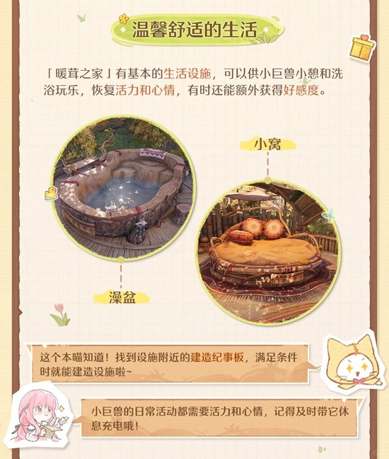 「暖茸之家」有基本的生活设施,可以供小巨兽小憩和洗浴玩乐,恢复活力和心情,有时还能额外获得好感度。