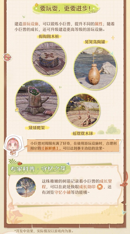 建造游玩设施,可以锻炼小巨兽,提升不同的属性;随着小巨兽的成长,还可升级建造更高等级的游玩设施。