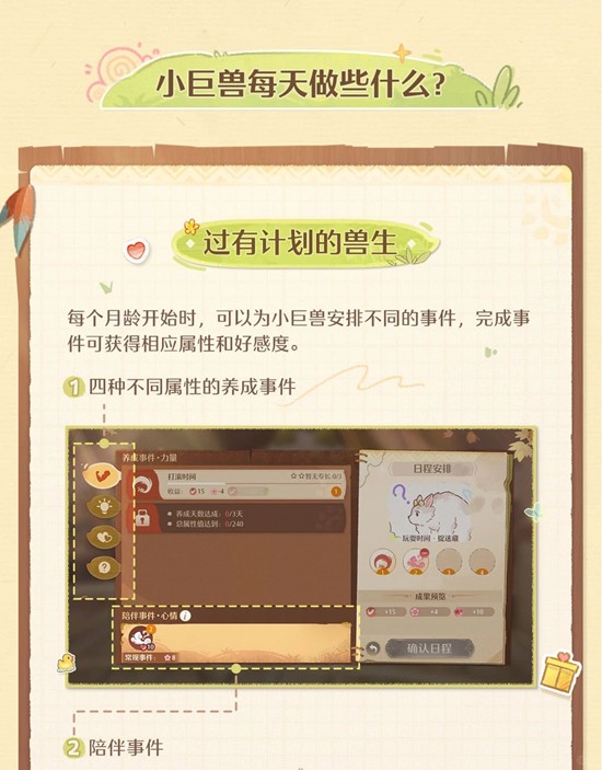 每个月龄开始时,可以为小巨兽安排不同的事件,完成事件可获得相应属性和好感度。