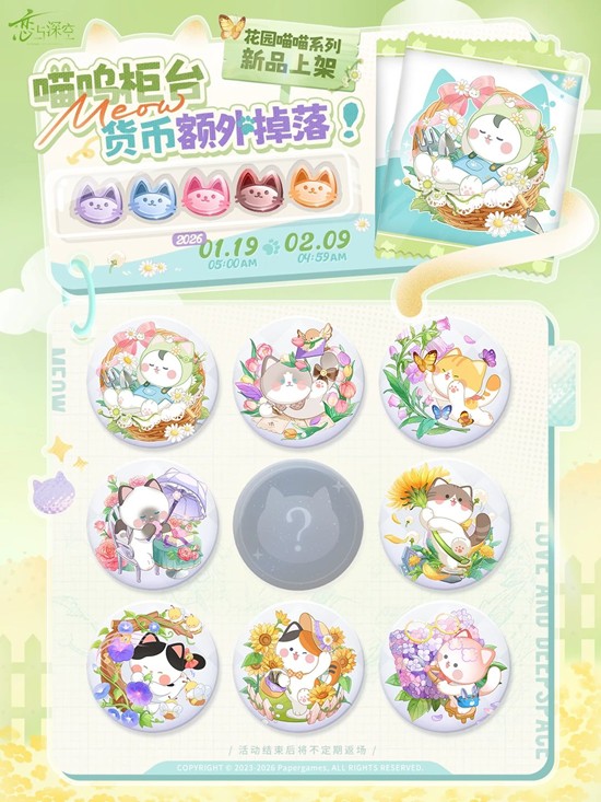 恋与深空喵呜币额外掉落,花园喵喵系列徽章将在1月19日上新~全新「花园喵喵」系列喵呜徽章限时上新,收集额外掉落的限定喵呜币来抽取吧!使用限定喵呜币,可在活动期间抽取「花园喵喵」系列徽章。共有8种普通款+1种隐藏款徽章等你收集!一起来和小编看看吧~