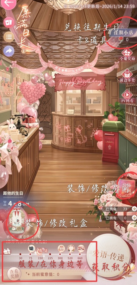 点击爱语传递,获取蜜意值(累计积分拿今年的道具)和澄澈绽放(在兑换商店换往年生日卡和道具)