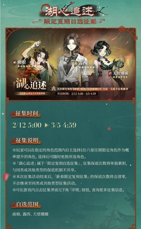 抽取建议:这里就看大家各自的配队了,薪血缺玛丽安娜、野树梅,电能卡戎灰调蓝告死鸟,启示阿莱夫花环,追击圈儿图图等
