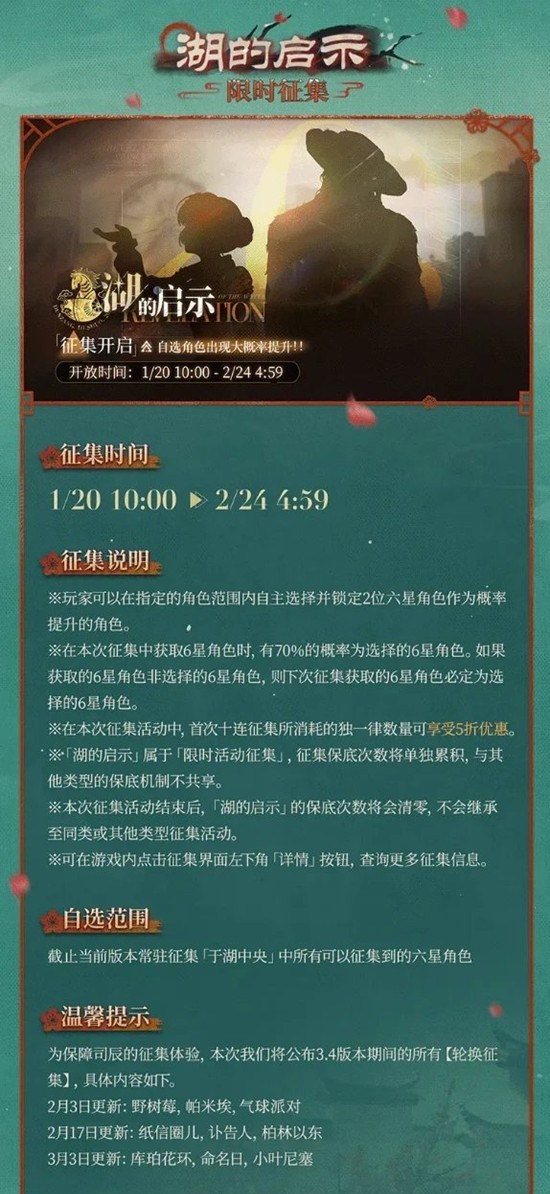 抽取范围:当前版本内所有进入常驻池的角色,自选2只为UP,抽取70%概率为当前UP角色,池子不继承会清空