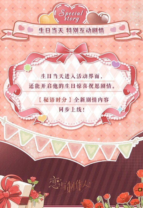 每日抽取心愿券,阅读专属剧情,解锁特殊纪念礼,生日当天记得进游戏过生日,拿生日背景